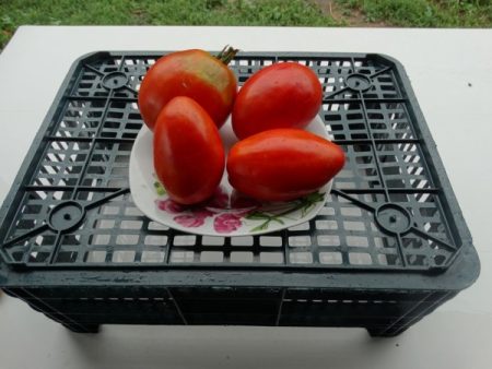 열매는 무겁고 무게는 200~250g입니다. 길쭉한 타원형 모양은 단고추와 비슷합니다. 껍질은 붉고 줄기 근처에 반점이 있을 수 있습니다. 과육은 부드럽고 뒷맛이 좋습니다. 한 그루에서 2~2.5kg의 열매가 열립니다.