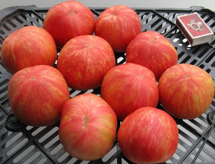 열매는 심장 모양에 타원형이며, 작고 둥근 끝이 있습니다. 달콤하고 약간의 신맛과 풍부한 토마토 향이 특징입니다. 토마토의 평균 중량은 50~70g입니다. 껍질은 단단하고, 과육은 붉은 분홍색이며 즙이 많고 약간 당도가 높습니다. 씨앗실은 네 개 이하이며 씨앗은 몇 개 있습니다. 토마토는 얼룩덜룩하며, 주요 색상은 빨간색입니다. 불규칙한 노란색과 주황색 줄무늬가 줄기에서 뻗어 나와 토마토 전체에 퍼져 있습니다.