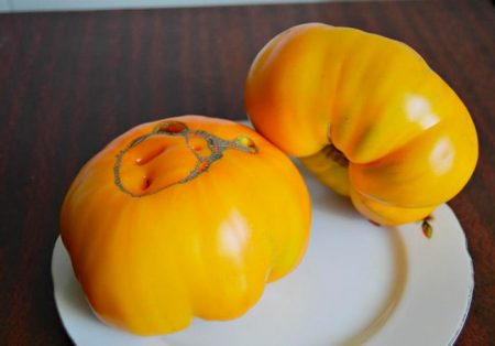 덤불은 굵은 줄기를 가지고 왕성하게 자랍니다. 이 식물은 무한생장형이므로 지지대와 꼬집기가 필요합니다. 두 줄기로 나누어 키우면 수확량이 많습니다. 잎은 잘 발달되어 있으며, 잎은 크고 짙은 녹색입니다. 러시아 남부에서는 노지에서 재배할 수 있지만, 중부 및 북부에서는 비닐 덮개 아래에서 토마토를 재배하는 것이 좋습니다. 평균 수확량은 1제곱미터당 7~8kg입니다. 열매는 크지만, 덤불 하나당 열리는 열매가 많지 않아 한 그루에서 2~2.5kg을 수확할 수 있습니다.