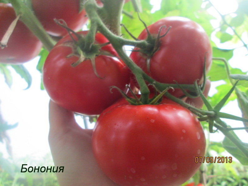 이 품종에 만족합니다. 면역력이 뛰어나고 제가 재배하는 동안 해충의 공격을 받은 적이 한 번도 없습니다. 온실에 심었는데, 수분이 부족하면 잎이 시들기 시작하는 것을 발견했습니다. 토마토는 보기에도 좋고, 크기가 거의 비슷해서 통과일 통조림으로 만들기에 안성맞춤입니다. 8월 초부터 수확을 시작했는데, 참고로 보노니아는 꽤 오랫동안 보관할 수 있습니다.