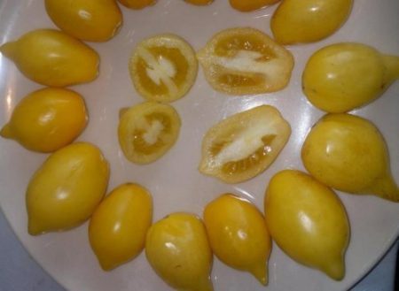 "세계의 경이로운 토마토"는 보기에도 좋고 비타민이 풍부하며 당과 산의 균형이 잘 잡혀 있어 수제 주스로 마시기에 좋습니다. 크기가 작아 캔에 담기에도 적당하며, 작은 토마토라도 리터 크기의 병에 넉넉하게 들어갑니다. 맛도 훌륭합니다. 독특한 색깔은 테이블이나 병을 환하게 밝혀줍니다. 생으로 먹기에도 좋습니다.