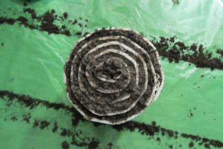 "달팽이" 전체에 흙을 채우고, 말아서 고무줄로 고정한 후, 수직으로 놓고, 흙을 더 얹어 롤의 모든 돌기를 덮습니다.