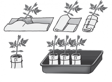 묘목은 컵, 화장지, 상자 등 어떤 용기에든 옮겨 심을 수 있습니다. 하지만 가장 편리한 방법은 묘목을 플라스틱 "기저귀"에 옮겨 심는 것입니다. 식품 등급 플라스틱 봉지가 이러한 목적에 이상적입니다.