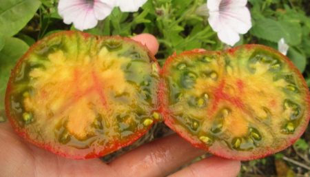 열매는 납작하고 둥글며, 줄기 근처에 약간 주름이 잡혀 있고, 무게는 80~300g입니다. 토마토는 아름다운 라즈베리 레드 색상에 녹색 줄무늬가 있습니다. 자르면 과육은 여러 개의 방으로 이루어진 녹색이며, 붉은 반점과 줄무늬가 있습니다. 껍질은 촘촘하고 과육은 수박처럼 달콤하고 과일 향이 풍부합니다.