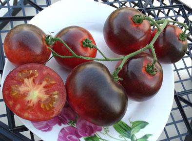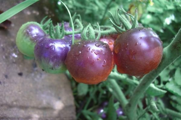 열매는 둥글둥글하며 납작한 모양입니다. 이 토마토의 특징은 색깔입니다. 열매의 한쪽 면은 보라색이고, 다른 쪽 면은 빨간색이나 버건디색입니다. 햇빛이 토마토에 직접 닿는 부분은 보라색이 더 강합니다. 과육은 진한 빨간색이고, 심은 연한 빨간색입니다. 씨앗은 노란색이며 녹색 껍질에 싸여 있습니다. 토마토는 단맛이 강하고, 은은한 신맛이 있어 느끼기 어렵습니다.