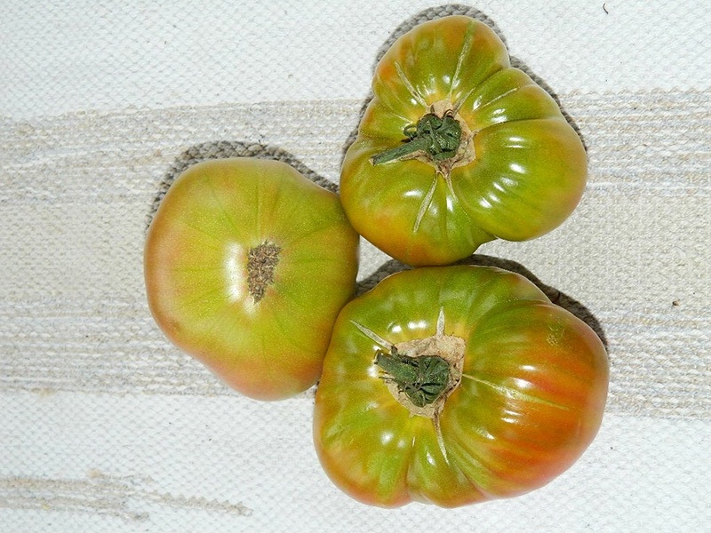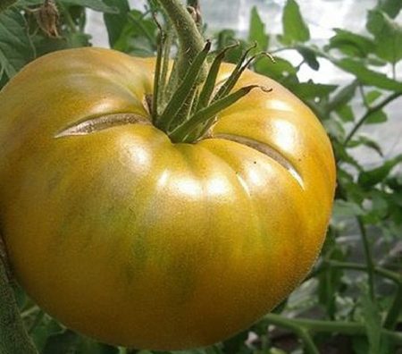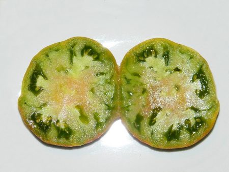 열매는 납작하고 둥글다. 껍질은 매끈하지만, 아랫부분에 특유의 갈색 반점이 있다. 기술적으로는 익었을 때 녹색을 띠지만, 익은 열매는 분홍색 반점이 있는 올리브 그린색이다. 과육은 즙이 많고 달콤하며 분홍빛이 도는 녹색이다. 열매에는 많은 씨앗이 들어 있다. 토마토의 평균 무게는 150~300g이다. 토마토는 두 개의 줄기로 갈라진다.