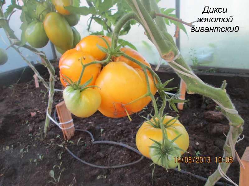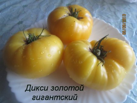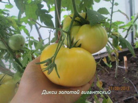 딕시 골든 자이언트는 가장 생산적인 토마토 중 하나로 여겨집니다. 심지어 악천후에도 한 그루에서 최소 3.5kg의 열매가 맺힙니다. 첫 번째 꽃차례는 여덟 번째 잎 위에 나타나고, 이후 세 잎마다 꽃송이가 맺힙니다. 한 송이에서 최대 9개의 토마토가 열립니다. 토마토의 평균 무게는 300~450g이며, 개별 열매의 무게는 최대 800g, 때로는 최대 2kg까지 나갑니다. 이 품종은 첫 서리가 내릴 때까지 열매를 맺습니다.