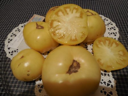 이 덤불은 키가 2m까지 자라고 튼튼하며 잎은 규칙적입니다. 비프스테이크 토마토는 균일하게 납작하고 둥글며, 때로는 골이 있습니다. 열매는 매우 크고 흰색과 노란색이며, 때로는 황주황색이고, 분홍색 면이 있습니다. 맛은 상쾌하고 달콤하며 신맛이 없고, 토마토 특유의 과일 향이 납니다. 토마토는 과육이 많고, 씨방은 작으며, 씨앗이 적고 껍질은 얇습니다.