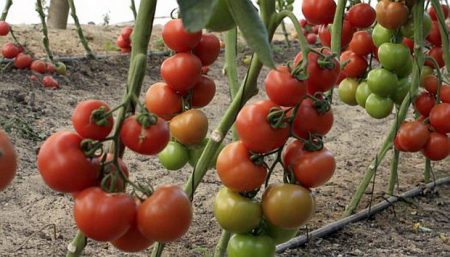 숙성 과정에서는 세 번째 비료 공급이 필요합니다. 토마토에 즙이 가득 차고, 크기가 커지고, 색깔이 균일해지도록 두 번째 비료 공급과 동일한 성분으로 구성된 영양 혼합물의 일부를 덤불 아랫부분에 추가로 공급합니다.