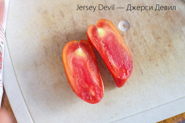 오랫동안 비가 오면 토마토가 물렁해지거나 터질까 봐 걱정이 많았습니다. 저지 데블 재배자들이 갈라짐에 강하다고 했던 말이 맞는 것 같습니다. 과일은 단단하고 과육이 풍부하며 적당히 즙이 많습니다.