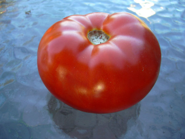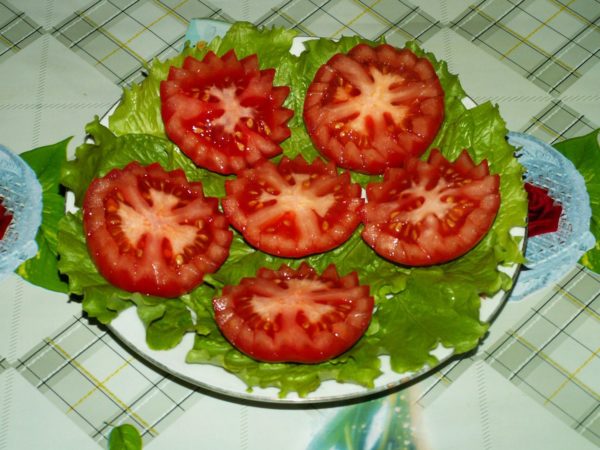 이 품종의 토마토는 정해진 시기에 가지치기가 필요합니다. 최대 1미터까지 자랍니다. 이 품종의 덤불은 고품질 수확을 위해 최대 세 개의 줄기까지 기를 수 있습니다. 이 식물은 빽빽한 잎과 진한 진홍색 열매가 특징입니다. 토마토는 납작하고 둥글며 크기가 상당히 큽니다. 열매 하나의 평균 무게는 2,500g입니다. 관리 및 재배 조건에 따라 토마토의 무게는 최대 300g까지 나갈 수 있습니다.