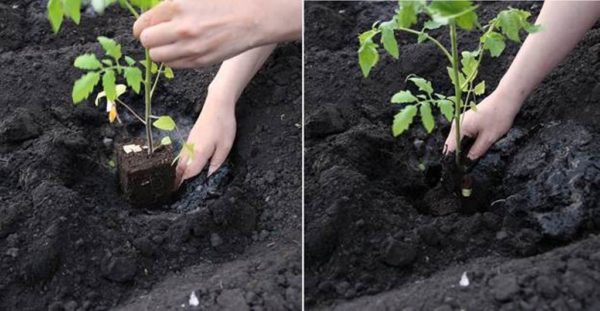 준비된 구덩이에 묘목 흙과 함께 식물을 심습니다. 뿌리에 손상을 주지 않고 심는 것이 중요합니다. 그 후, 컵에서 나온 흙을 주변 흙으로 덮어 식물 주변의 영양분 유지력을 극대화합니다.