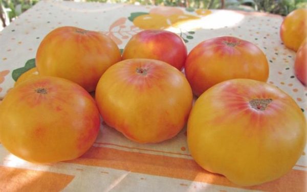 기술적 성숙기에 도달한 과일은 연한 녹색을 띠다가 점차 노란색으로 변합니다. 생물학적 성숙기는 토마토 전체가 황금색으로 변하고 작은 붉은색 반점이 생기면 쉽게 알 수 있습니다. 이로 인해 과일은 주로 노란색-주황색을 띱니다.