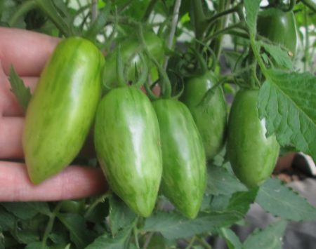 토마토의 색깔은 항상 균일하지는 않습니다. 토마토는 수박과 비슷해 보이기도 합니다. 토마토 표면은 에메랄드빛 바탕에 노란색 줄무늬가 있으며, 가장 익을 무렵에는 옅은 주황색으로 변합니다. 토마토 한 개의 무게는 보통 100~150g입니다. 토마토는 원뿔 모양으로 길이 9~13cm이며 끝이 뾰족합니다. 과육은 녹색이고 즙이 많으며, 껍질은 매끄럽고 단단합니다.