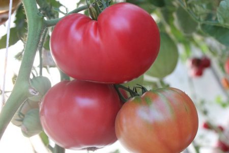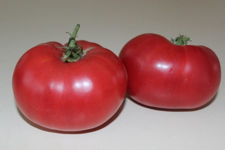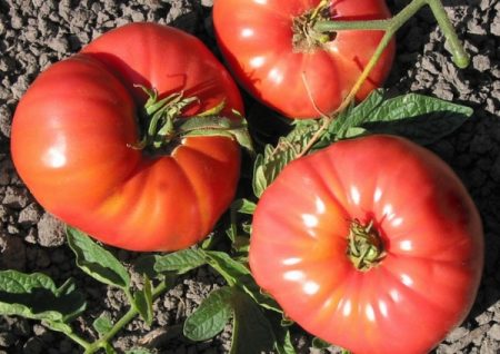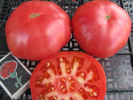 - 토마토 열매는 크고 둥글며 약간 납작합니다. 색깔은 분홍색이고, 과육은 붉은색이며, 껍질은 매끄럽고 얇습니다. 전반적으로 과육이 두껍고 단단하며, 씨가 거의 없습니다. 토마토의 무게는 400g에서 1,000g 사이입니다.