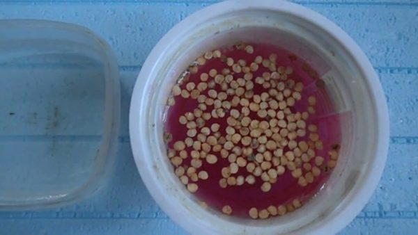 파종 전, 선별된 씨앗을 여러 겹의 거즈로 감싸고 따뜻한 과망간산칼륨 용액에 20분간 담가 소독합니다. 이후 거즈에서 씨앗을 꺼내지 않고 흐르는 물에 깨끗이 헹굽니다.