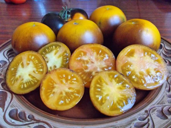 - 열매는 둥글고 평균 무게는 100~140g입니다. 특이한 생김새 때문에 다른 과일이나 채소와 혼동하기 쉽습니다. 토마토는 주황색에 짙은 보라색 어깨를 가지고 있습니다.