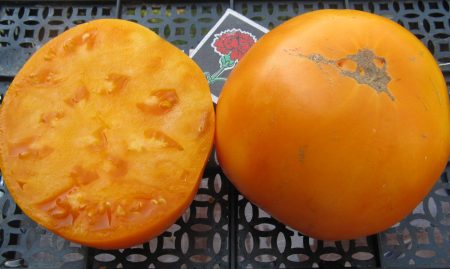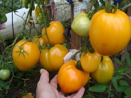 황소심장 토마토는 어떤 사진이든 그 독특한 모양, 즉 기분 좋고 밝은 주황색을 띤 하트 모양을 보여줍니다. 무게는 150g이지만, 더 큰 400g짜리 토마토도 있습니다. 씨가 적고, 건조 중량은 중간 정도이며, 내부 공간이 적당해서 요리에 사용하기 편리합니다. 샐러드용으로 잘게 썰어도 모양이 잘 유지됩니다.
