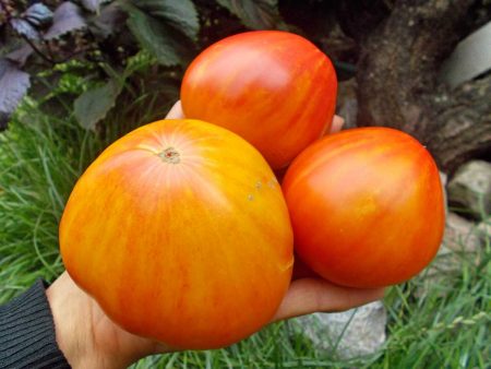 이 품종은 두 가지 색깔을 가진 이색 토마토로 분류할 수 있습니다. 덤불 자체가 상당히 굵어서 토마토가 서로 떨어져 자라 크고 풍성한 토마토를 생산합니다.