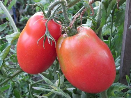 열매는 길쭉하고 자두 모양이며, 중간 정도의 단단함을 가지고 있으며, 줄기 근처에 녹색 반점이 없습니다(대부분 큰 토마토 품종의 특징적인 특징이기는 하지만). 토마토는 원래 분홍색이며, 재배 조건에 따라 약간 더 진하거나 밝을 때도 있습니다.
