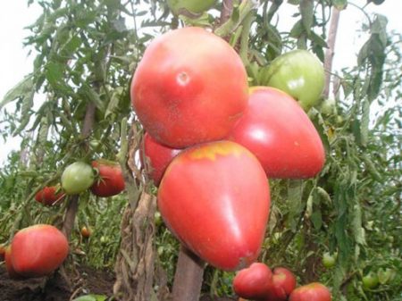 과일은 아름답고 크며, 무게는 150~200g이고, 어떤 것은 450g까지 나가기도 합니다(처음 열리는 토마토가 보통 가장 크고, 그다음에 열리는 플라밍고 토마토가 점점 작아지지만, 아주 작은 토마토는 극히 드뭅니다).