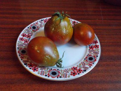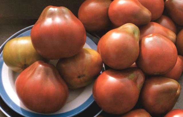 토마토는 배 모양의 자두와 비슷하게 생겼습니다. 특히 적갈색에 매료되었습니다. 토마토는 맛있고 살짝 달콤합니다. 갈라지지 않고, 이 교배종은 다양한 종류의 부패병에 대한 저항성을 보였습니다. 저는 정원 화단에서 토마토를 재배해서 병에 담아 절이는 데 사용했습니다. 전반적으로 품종이 마음에 들었고, 저장성도 좋습니다.