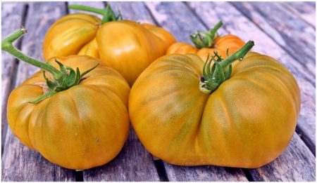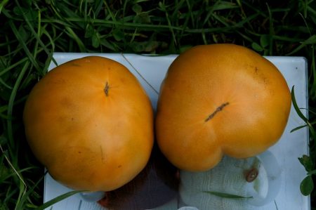 토마토는 납작하고 둥글며, 곁가지는 굵고 통통한 어깨를 가지고 있습니다. 완전히 익으면 갈색이 도는 주황색(황토색)으로 변합니다. 토마토는 크기가 크며 무게는 200~350g입니다. 껍질은 두껍고, 과육은 육질이 풍부하며 즙이 많고 부드러우며, 입에서 살살 녹는 풍부한 토마토 풍미를 자랑합니다. 익은 토마토는 생으로 먹거나, 야채 주스나 다양한 소스를 만들거나, 겨울철 보관을 위해 통조림으로 만들 수 있지만, 통째로 먹을 수는 없습니다. 토마토가 커서 병에 담기지 않기 때문입니다.