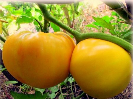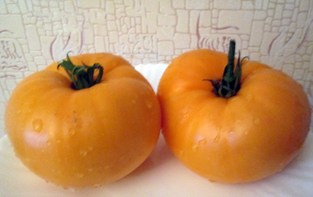 열매는 약간 납작하고 둥글며, 균일한 주황색을 띱니다. 속은 작은 엽편으로 갈라져 있고, 씨앗이 거의 없으며, 즙이 많고 육질이 풍부합니다. 토마토 한 개의 무게는 최대 600g까지 나갈 수 있지만, 평균 450g을 넘지 않습니다.