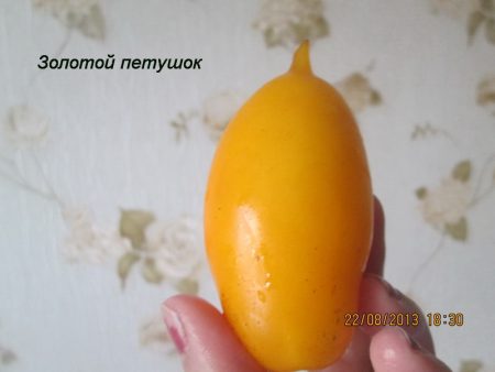 열매는 밝은 노란색에 뚜렷한 "방추형"(길쭉한) 모양을 하고 있으며, 매우 빽빽하여 무게는 85~120g입니다. 조건이 좋으면 한 송이에서 5~10개의 토마토가 열립니다. 토마토는 매우 맛있고, 풍부하고 기분 좋은 토마토 풍미와 은은한 단맛이 어우러집니다. 열매는 과육이 많고 씨앗이 적어 먹기가 매우 좋습니다.