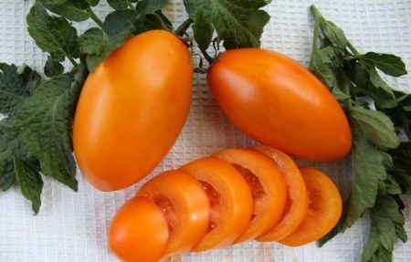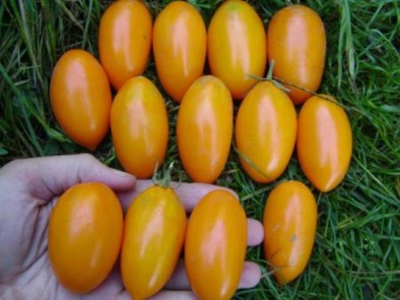 이 품종의 열매는 타원형이고 크기가 작으며 무게는 70~80g입니다. 토마토는 황주황색 또는 황금빛 노란색을 띱니다. 껍질은 두껍고 익어도 갈라지지 않습니다.