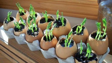 심기 전에 껍질을 계란 용기에 넣고 흙을 채웁니다. 모종이 자라는 동안 용기 옆면에서 용출된 칼슘이 모종에 흡수되어 튼튼하게 자랍니다.