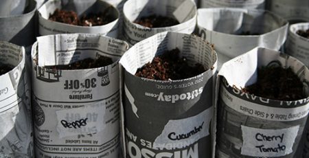 종이 화분을 만들려면 둥근 병을 신문지로 여러 겹 감싼 후, 종이 가장자리를 풀로 고정합니다. 신문지를 접어 아래쪽으로 붙인 후 풀로 고정합니다. 컵을 쟁반에 놓고 흙을 채웁니다. 심을 때는 종이를 찢어주세요.