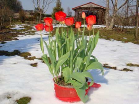 모든 것이 제대로 되면 2월 말에 첫 꽃이 필 것입니다. 튤립은 선별적으로 잘라냅니다. 키가 크고 곧은 줄기, 풍부한 색채를 띤 큰 꽃봉오리, 그리고 손상이 없는 식물을 선택합니다. 잘라낸 후에는 잎을 하나 이상 남겨두세요. 그래야 구근이 계속 자라는 데 도움이 됩니다.