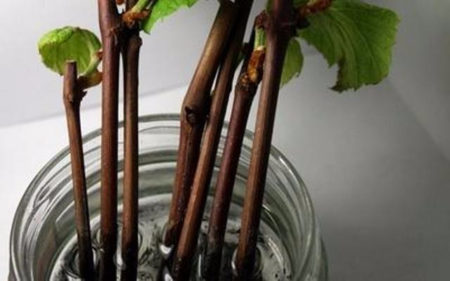 꺾꽂이한 가지를 꿀(물 한 통당 1큰술)을 넣은 물에 24~48시간 동안 담가둡니다. 그런 다음 성장 및 발근 촉진제를 넣은 물에 3시간 동안 담가둡니다. 1리터 병 바닥에 소량의 물을 붓고, 꺾꽂이한 가지를 뿌리가 아래로 가도록 병에 담습니다. 햇볕이 잘 드는 창가에 놓습니다. 14~20일 후에 뿌리와 새싹이 나옵니다.