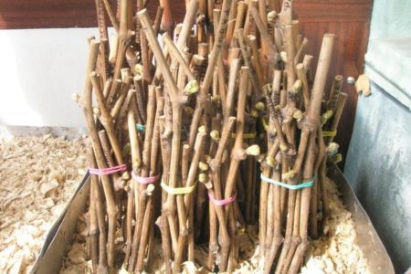 꺾꽂이한 가지를 뚜껑이 밀봉된 플라스틱 병에 담아 약 2~6°C(35~40°F)의 냉장고에 보관합니다. 심은 가지에 곰팡이와 부패병이 있는지 매달 검사합니다. 질병 징후가 발견되면 꺾꽂이를 물로 헹구고 과망간산칼륨이나 황산구리 용액에 담급니다. 꺾꽂이가 마르면 물에 6시간 동안 담가둡니다.