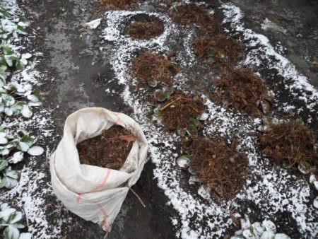 미리 준비한 마른 흙, 토탄, 모래, 톱밥을 섞어 덤불 뿌리 주변에 뿌립니다. 덤불 하나당 평균 한 통의 혼합물이 필요합니다. 마른 잎을 덮개로 사용할 수 있으며, 썩지 않는 참나무 잎을 사용하는 것이 좋습니다. 11월 첫서리가 내리면 가문비나무 가지로 덤불을 덮어줍니다. 겨울에는 눈이 그 위에 쌓입니다.