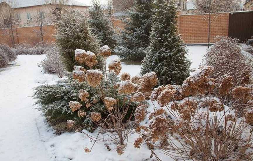 수목형, 원추형, 잎자루형 수국은 겨울에 별도의 덮개가 필요하지 않습니다. 이 식물들은 낮은 온도에도 잘 견딥니다. 생장기의 특징 중 하나는 어린 새싹에서 꽃이 핀다는 것입니다. 따라서 얼어붙은 부분을 제거하기 위해 봄에 가지치기를 하는 것이 좋습니다.