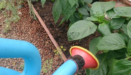 - 심은 지 2주 후에 고추에 뮬린이나 닭똥을 비료로 줍니다. 물 10리터당 뮬린 비료 1리터, 닭똥 비료 0.5리터를 사용합니다. 각 식물 아래에는 용액을 1리터 이하로 붓습니다.