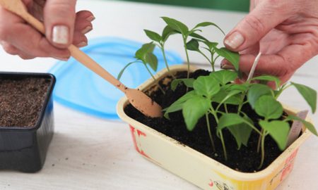 이식할 묘목은 가장 좋은 것을 고르는데, 먼저 싹이 트는 묘목이 특히 좋다고 여겨집니다. 이식하기 두 시간 전에 물을 충분히 줍니다. 준비된 용기에 흙을 채우고 최대 6cm 깊이의 구멍을 뚫습니다. 뿌리 덩어리와 함께 묘목을 조심스럽게 용기에 옮깁니다. 묘목 줄기는 2cm 깊이로 묻지 않습니다. 이제 묘목에 물을 충분히 줍니다.