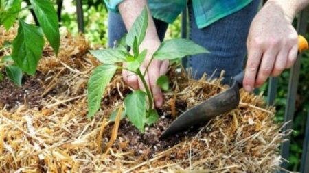 이 방법은 건기 동안 고추의 급격한 수분 증발을 방지할 수 있습니다. 짚, 갓 자르거나 미리 말린 풀, 그리고 썩은 톱밥을 얇게 덮어 멀칭으로 사용할 수 있습니다.