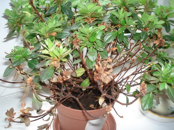 꽃의 토양에 대해 조사하는 것이 중요합니다. — 이렇게 하려면 화분에서 꺼내야 합니다. 진달래는 신선하게 보이도록 가게에서 물을 주는 경우가 많습니다.