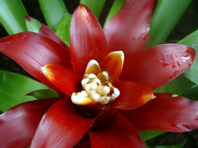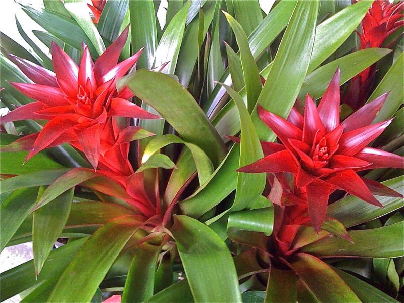 - 구즈마니아 산기네아 - 꽃차례는 산방꽃차례이고, 7~12개의 꽃으로 구성되며, 꽃이 피는 동안 잎은 짙은 붉은색으로 변합니다.