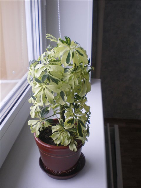 - 아르보레센스(Arborescens)는 대만과 하이난이 원산지인 상록 관목으로, 아파트에서 키우기에 매우 적합합니다. 최대 4미터까지 자랄 수 있습니다. 손바닥 모양의 겹잎은 7~9개의 20센티미터 길이의 잎을 가지고 있습니다. 꽃은 가지가 갈라진 원추꽃차례처럼 생겼습니다. 아르보레센스는 아마테(Amate)(관리가 훨씬 간편하고 해충에 취약함)와 골드 카펠라(Gold Capella)(야자수처럼 생겼으며 녹색에 반점이 있는 노란색 잎)와 같은 품종의 기반이 됩니다.