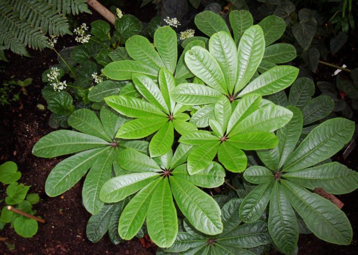 손바닥 모양의 이 식물은 큰 산형화서에 작은 꽃을 피우는데, 그 즙은 지역 치료사들이 피부 질환을 치료하는 데 사용합니다. 이 식물의 보라색 열매는 먹을 수 있으며 새들의 공격을 받기 쉽습니다.