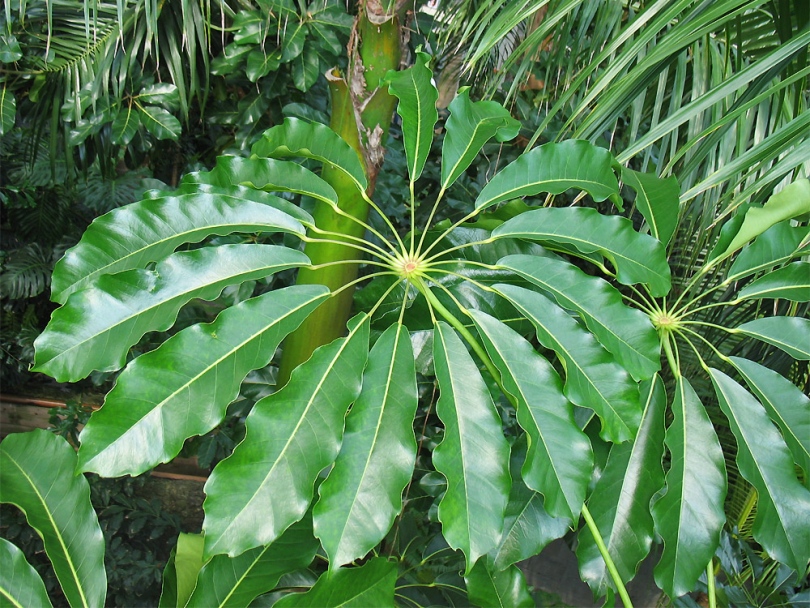 - 손바닥 모양. 뉴질랜드 셰플러라는 야생에서 최대 8미터까지 자랍니다. 손바닥 모양의 잎은 우산처럼 펼쳐지며, 최대 10개의 얇고 뾰족한 잎이 있습니다. 뉴질랜드 사람들이 기념품으로 대량 채취하면서 이 종은 점차 멸종되고 있습니다.
