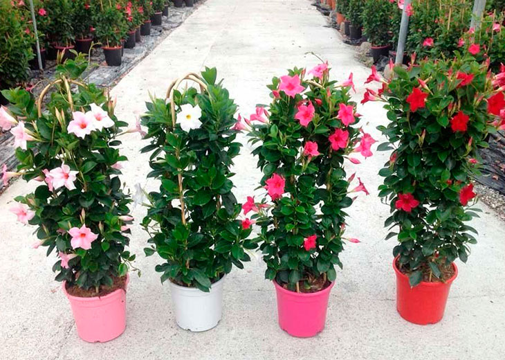 디플라데니아(Dipladenia) 또는 만데빌라(Mandevilla)는 협죽도과(Apocynaceae)에 속하는 덩굴식물입니다. 이 식물은 아메리카 열대 지방이 원산지입니다. 볼리비아에서 일하던 영국인들이 이 독특하고 아름다운 꽃을 피우는 덩굴을 보고 유럽으로 꽃을 가져왔습니다. 이 식물은 칠레 재스민, 브라질 재스민, 브라질 임파티엔스, 볼리비아 장미, 멕시칸 러브 트리라고도 불립니다. 꽃집들은 디플라데니아의 왕성한 성장과 오랫동안 피는 꽃에 매료됩니다.