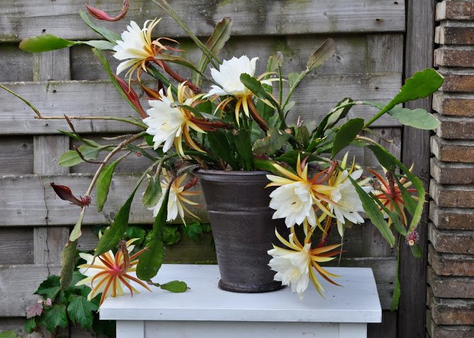 크고 깔때기 모양의 꽃이 새싹 끝에 피고, 색깔은 매우 다양합니다. 흰색이나 크림색 꽃봉오리가 가장 흔합니다. 꽃은 강렬하고 풍부한 향을 풍깁니다. 풍성한 꽃 덕분에 이 식물은 "난초 선인장"이라는 별명을 얻었습니다.