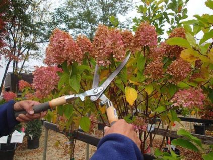 - 수국 수국은 키가 최대 2.5m에 달하는 큰 관목으로, 무성하고 둥근 수관을 가지고 있습니다. 피라미드 모양의 꽃차례는 꽃이 피는 동안 녹색에서 흰색, 분홍색, 또는 보라색으로 변합니다. 이 종은 과감한 가지치기가 필요하지 않습니다. 수국은 수관을 형성하고 수관을 솎아내며 수관을 다시 젊어지게 하는 등 적당히 가지치기를 합니다. 잔가지를 만지지 않는 것이 좋습니다. 한 생장점에 여러 개의 새순이 나타나면 가장 강한 새순을 남겨두고 나머지는 제거합니다. 약하고 손상된 가지도 제거해야 합니다. 수국에 새순을 젊어지게 하려면 2~3년에 걸쳐 점진적으로 진행합니다. 오래된 새순은 하나씩 잘라내고 그루터기는 10~15cm 높이로 남겨둡니다.