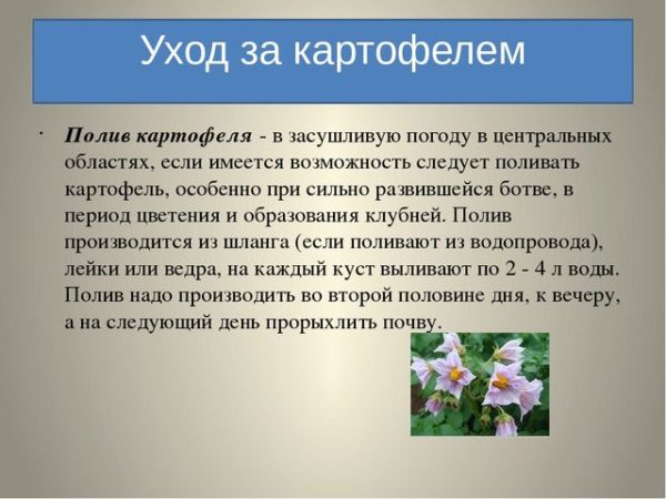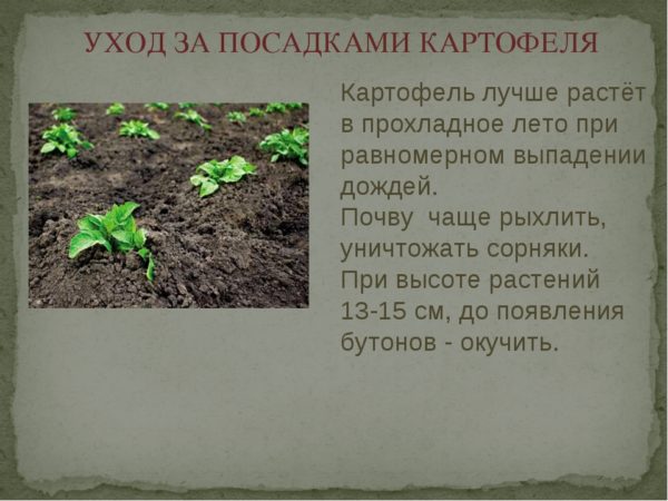 씨앗을 파종하기 전에, 영향을 받은 덩이줄기를 골라 황산구리로 처리한 후 토양 온도가 섭씨 10도까지 올라가면 바로 심습니다. 이 정도면 새싹이 동시에 제때 돋아나기에 충분합니다. 더 잘 자라려면 관리가 중요합니다. 처리가 덜 된 지역은 생장이 좋지 않습니다. 제 작업자들이 끊임없이 흙을 파고 물을 주고 경작하는 우선순위 지역은 자연적으로 수확량이 많고, 그 지역의 식물도 더 잘 자랍니다.