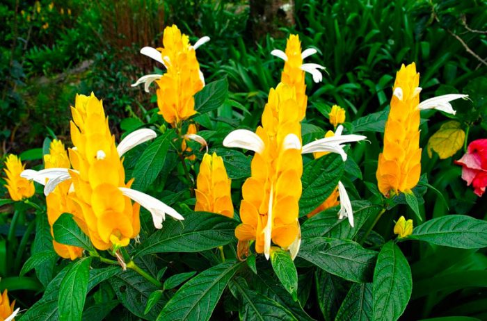 이 식물의 특이한 생김새는 노란색의 가시 모양의 포엽 때문입니다. 최대 10~13cm 길이의 포엽은 새싹 바로 위에 있습니다. 화려한 외관 때문에 많은 사람들이 이 식물의 포엽을 꽃으로 착각합니다. 두 개의 하얀 입술 모양으로 이루어진 이 식물의 실제 꽃은 포엽에서 살짝만 나와 있어 관상용으로는 적합하지 않습니다.
